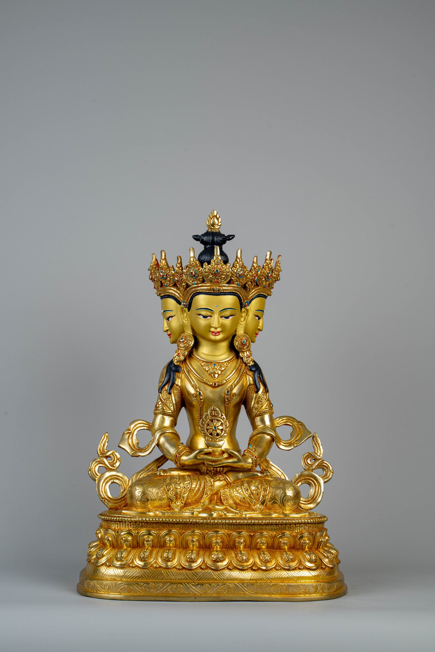 Vairocana is one of the five great Buddhas who represent the five directions (east, south, west, north, and center) and the five elements in Buddhism (ether, fire, water, air, and earth). Vairocana is associated with the central direction and the element of ether, and is frequently depicted as a cosmic or universal Buddha, embodying the primordial nature of reality, in Buddhist art.Vairocana is considered to be the embodiment of dharmakaya, or the "body of truth," and represents the fundamental nature of all phenomena, free of all dualities and conceptual elaboration. Vairocana is frequently depicted seated in the lotus position, his right hand forming the mudra (gesture) of turning the Dharma wheel and his left hand holding a lotus flower or resting in his lap.Vairocana is regarded as the primordial Buddha in some Buddhist traditions, the source from which all other Buddhas and enlightened beings emerge. Other traditions regard Vairocana as a reincarnation of Amitabha Buddha or Shakyamuni Buddha, or as a deity associated with specific practices or teachings.Vairocana is revered in many Buddhist schools, including the Mahayana, Vajrayana, and Shingon traditions, and is frequently the focus of meditation and ritual practices aimed at understanding the nature of ultimate reality.