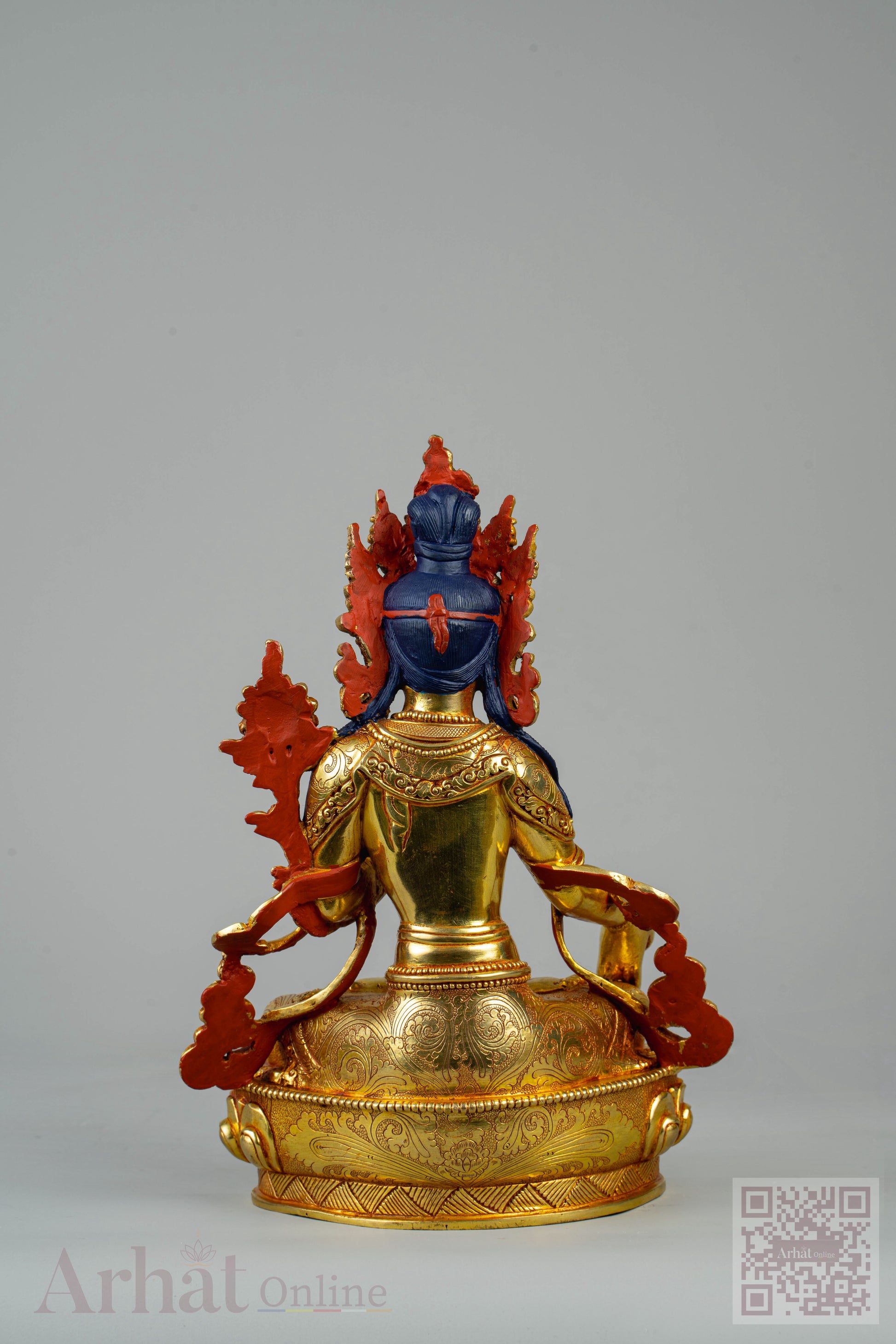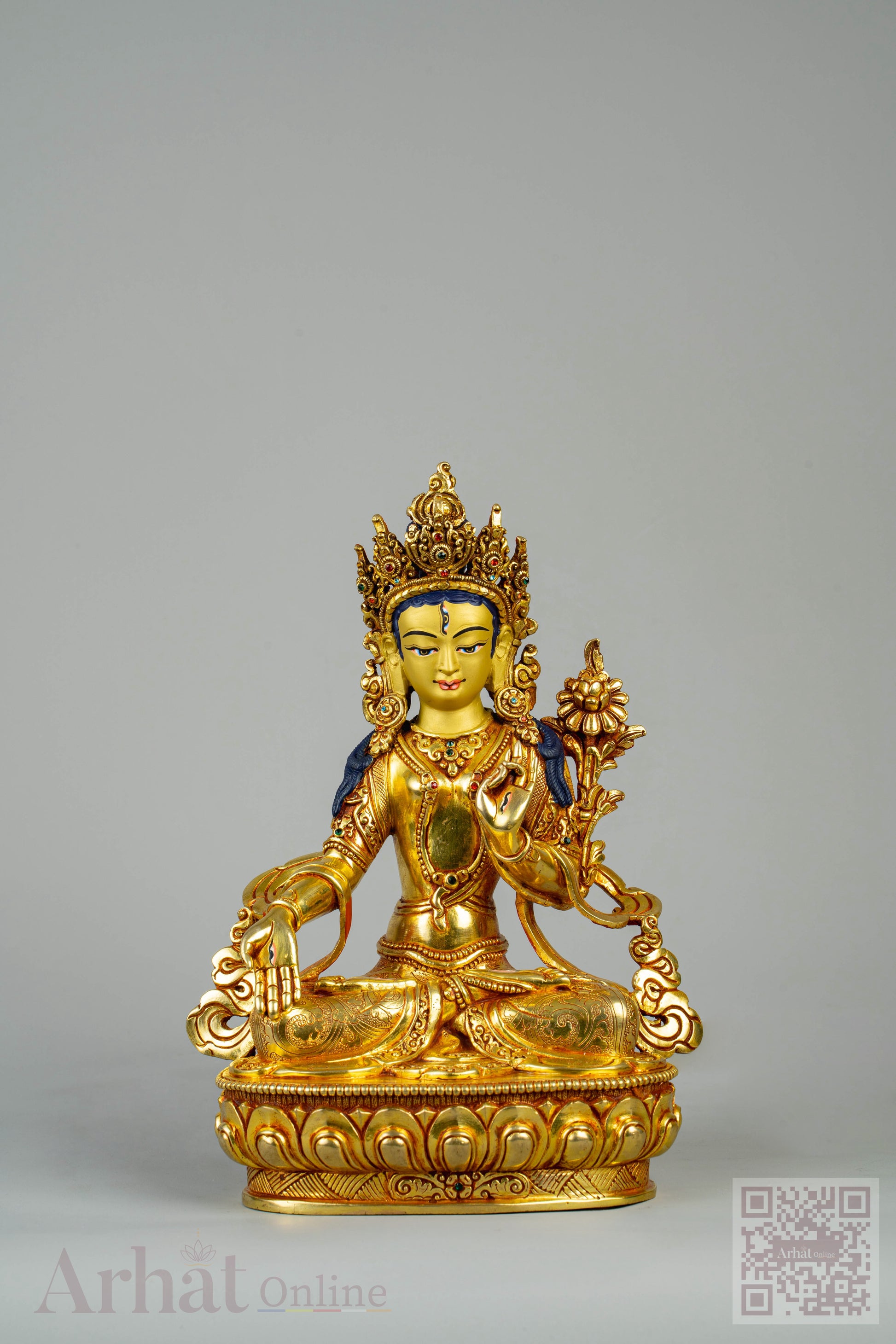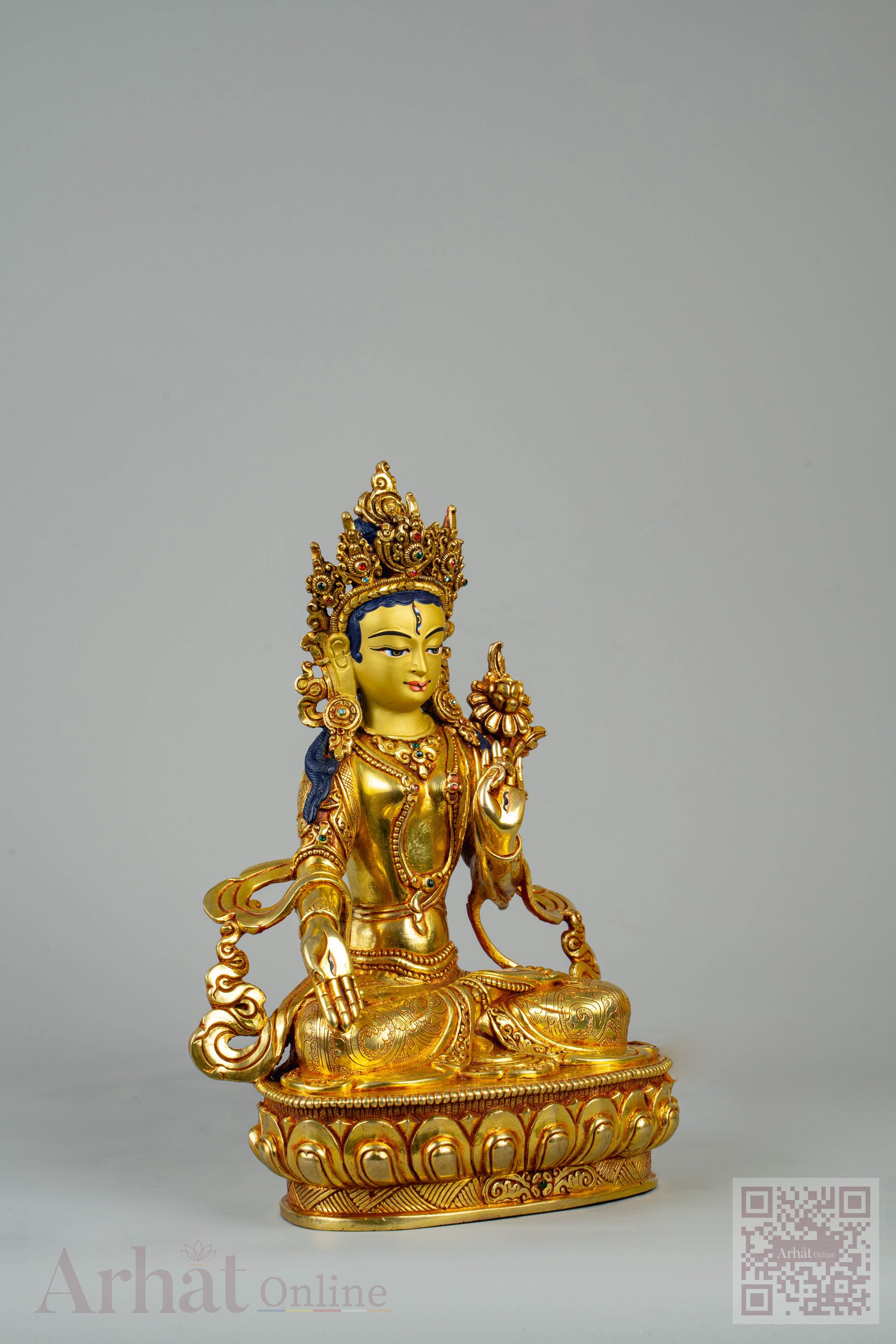 Meticulously crafted from copper, this White Tara statue is plated with lustrous gold, adding a touch of opulence to its divine presence. The delicate features of the deity's face are adorned with fine gold dust and acrylic paint, showcasing the skilled artistry that emanates from the heart of Nepalese craftsmanship.