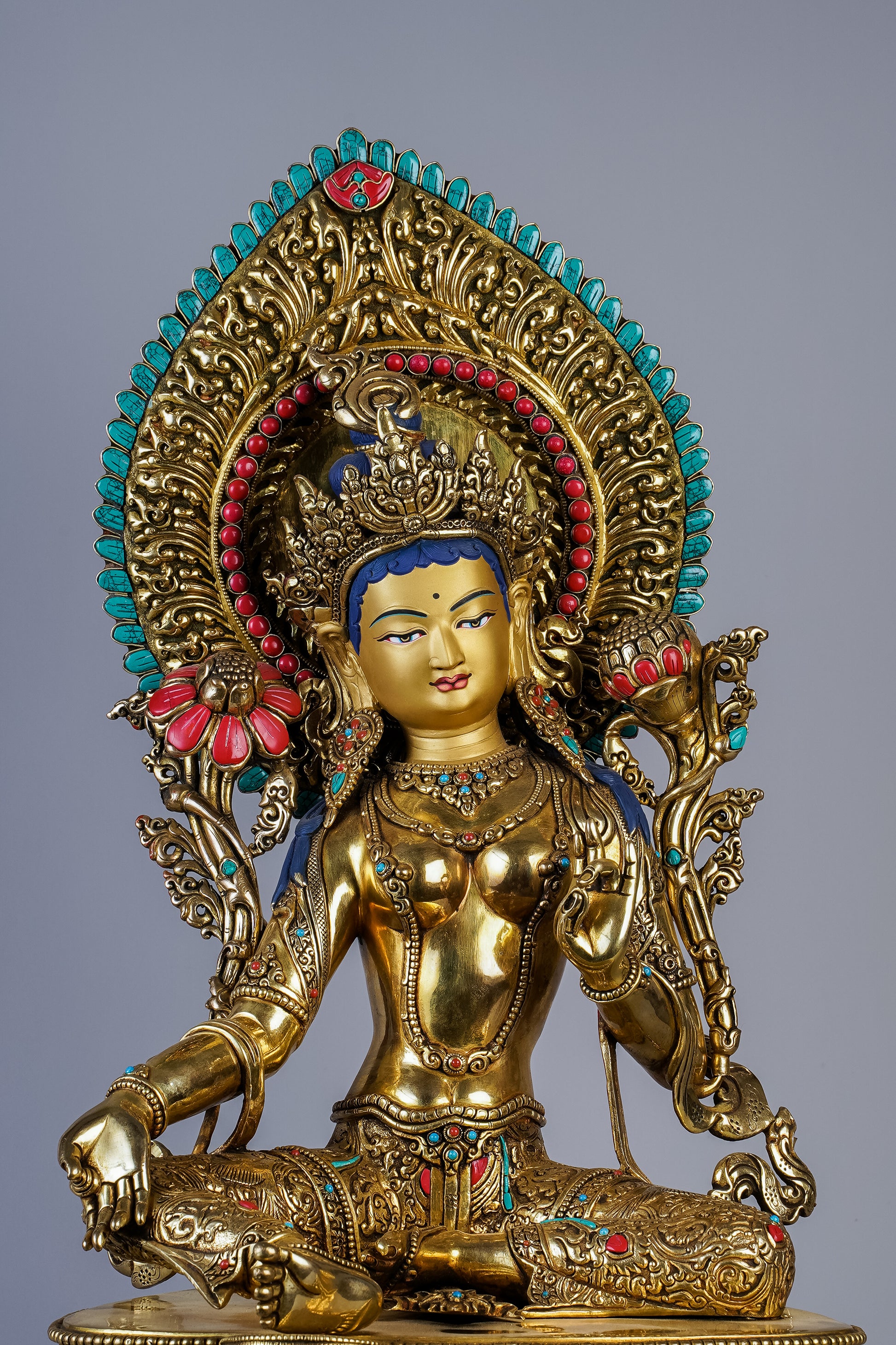 This statue depicts Green Tara, the swift liberator who responds instantly to suffering. She embodies compassionate action and fearless protection through dynamic iconographic posture.